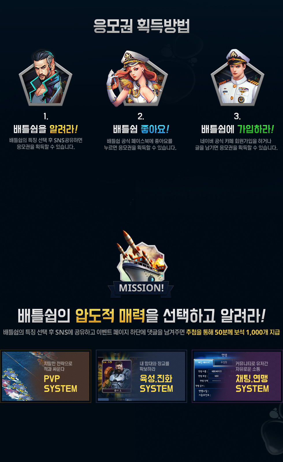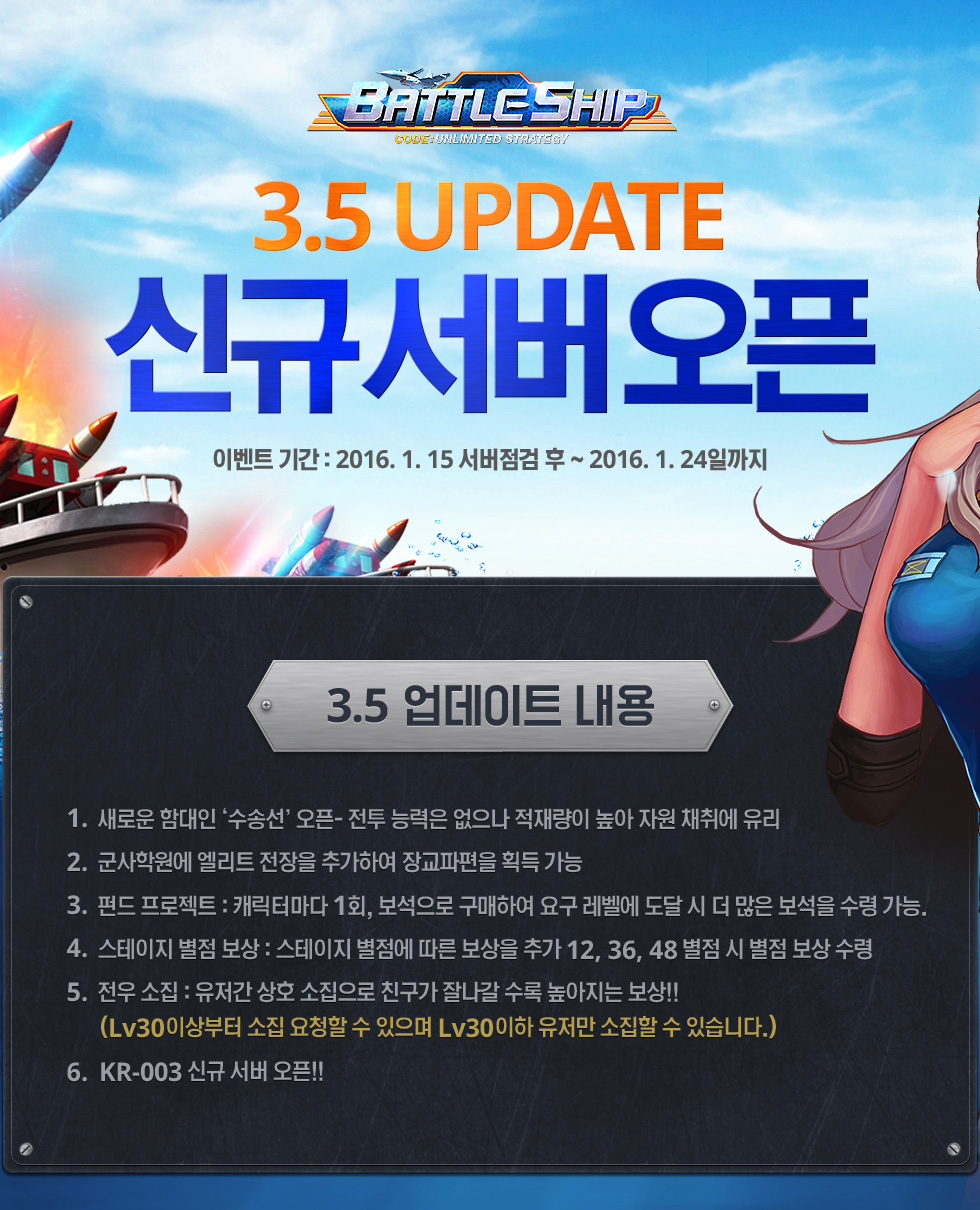 ㈜네오싸이언은 배틀쉽 3.5 업데이트 이벤트와 관련하여 다음과 같은 개인정보를 수집하고 있습니다. 개인정보 수집을 거부하는 경우 이벤트 참여에 제한 될 수 있습니다. 1) 수집하는 개인정보 항목 : 서버명, 캐릭터명, 휴대폰 번호 2) 개인정보 수집 · 이용 목적 : 게임 출시 안내 SMS 발송 및 이벤트 경품 지급 3) 개인정보의 보유 · 이용 기간 : 게임 출시 안내 및 경품 SMS 발송 후 1달 이내 폐기